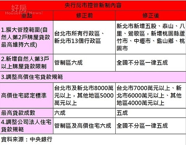 央行指出,高價住宅波動較大,銀行承作高價住宅貸款風險較一般貸款更高,因此有必要調整其認定標準及最高貸款成數;台北市高價住宅總價從8000萬元下修為7000萬元,新北市則下修至6000萬元,其他地區從5000萬元下調至4000萬元,以上高價住宅貸款最高成數從現行的六成降為五成。